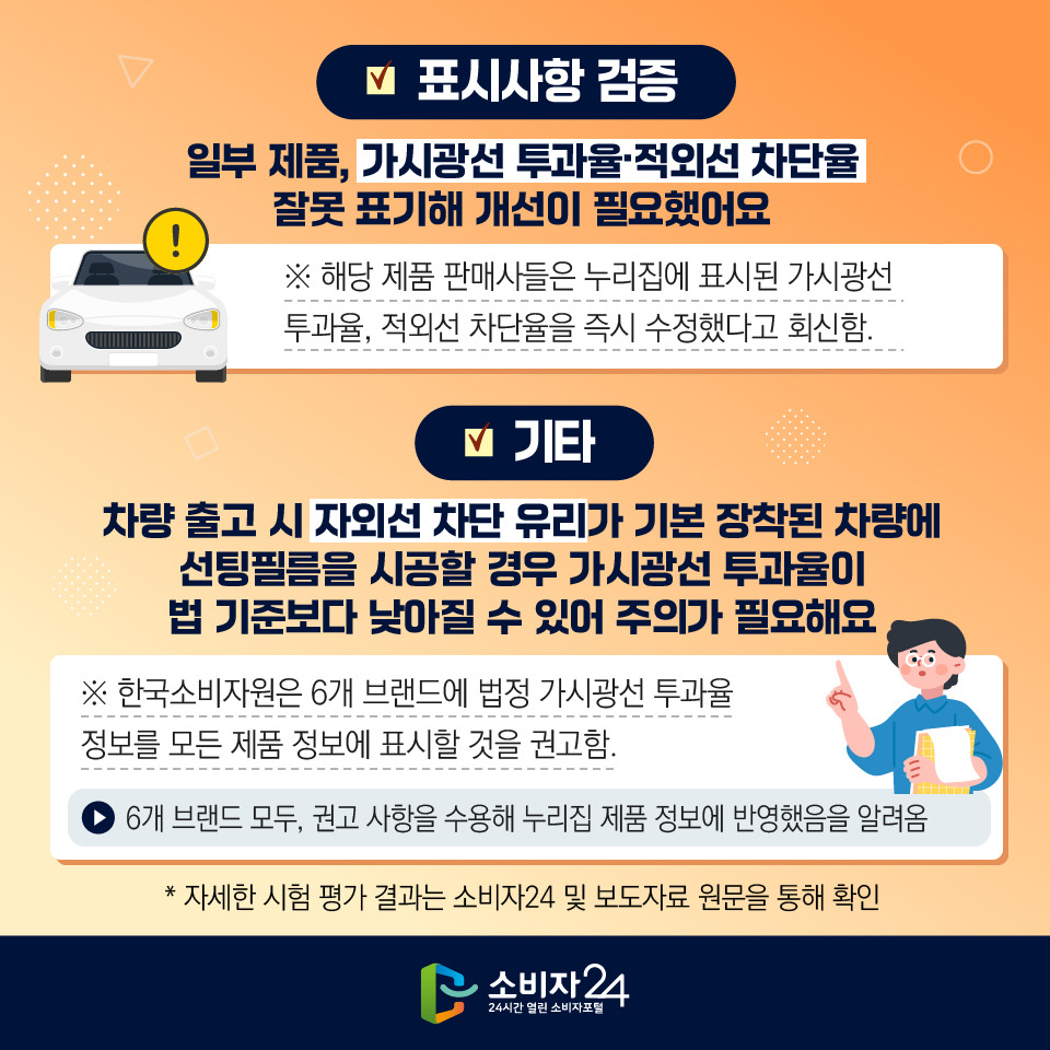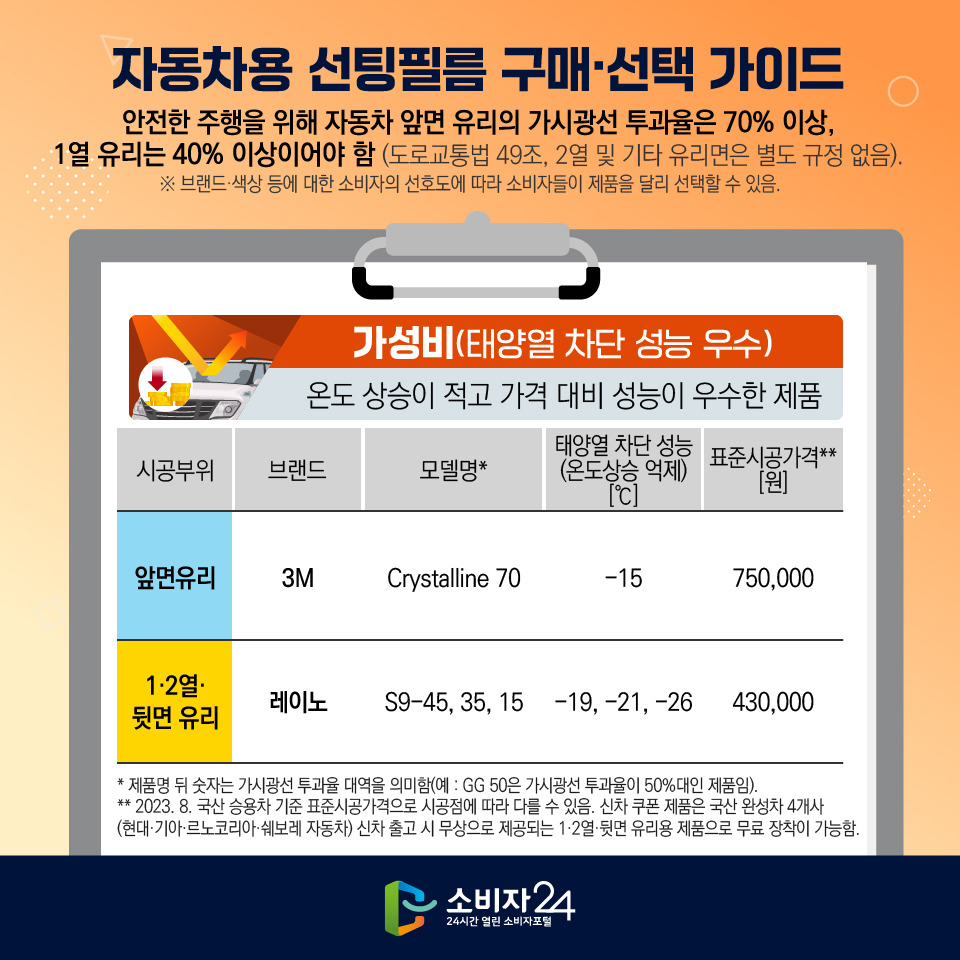 | 주1) 앞면 유리의 가시광선 투과율은 70% 이상, 1열 유리는 40% 이상이어야 함(도로교통법, 2열 및 기타 유리면은 별도 규정 없음). 주2) 공식 누리집에 게시된 표준시공가격으로 시공점에 따라 다를 수 있음(2023년 8월, 국산 승용차 기준). 신차 쿠폰 제품 : 국산 완성차 4개 사(현대・기아・르노코리아・쉐보레 자동차) 신차 출고 시 제공되는 1⦁2열⦁뒷면 유리용 제품으로 무료 시공이 가능함. 주3) 제조상의 결함(줄무늬, 필름 자체의 이물질, 갈라짐, 탈⦁변색, 기포, 벗겨짐 등)만 보증이 가능하며 시공상의 결함(유리와 필름 사이의 이물질 등)은 시공 후 3개월 보증함. |