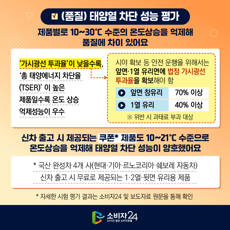 | 주1) 선호 제품 : 소비자 설문조사 결과 보유율이 높은 제품(2023.2. 소비자 505명 대상 한국소비자원 조사) 신차 쿠폰 제품 : 국산 완성차 4개 사(현대⋅기아⋅르노코리아⋅쉐보레 자동차) 신차 출고 시 무료로 제공되는 1⋅2열⋅뒷면 유리용 제품(레이노, 루마, 솔라가드, 3M) 앞면 유리의 가시광선 투과율은 70% 이상, 1열 유리는 40% 이상이어야 함(도로교통법). 주2) 수치가 낮을수록 어두움(KS L 2016⋅ISO 9050 기준 준용, 두께 3mm 판유리에 시공 후 380~780nm 파장을 측정). 주3) 공식 누리집에 게시된 표준시공가격으로 시공점에 따라 다를 수 있음(2023.8. 국산 승용차 기준). 신차 쿠폰 제품 : 국산 완성차 4개 사 신차 출고 시 제공되는 1⋅2열⋅뒷면 유리용 제품으로 무료 시공이 가능함. |